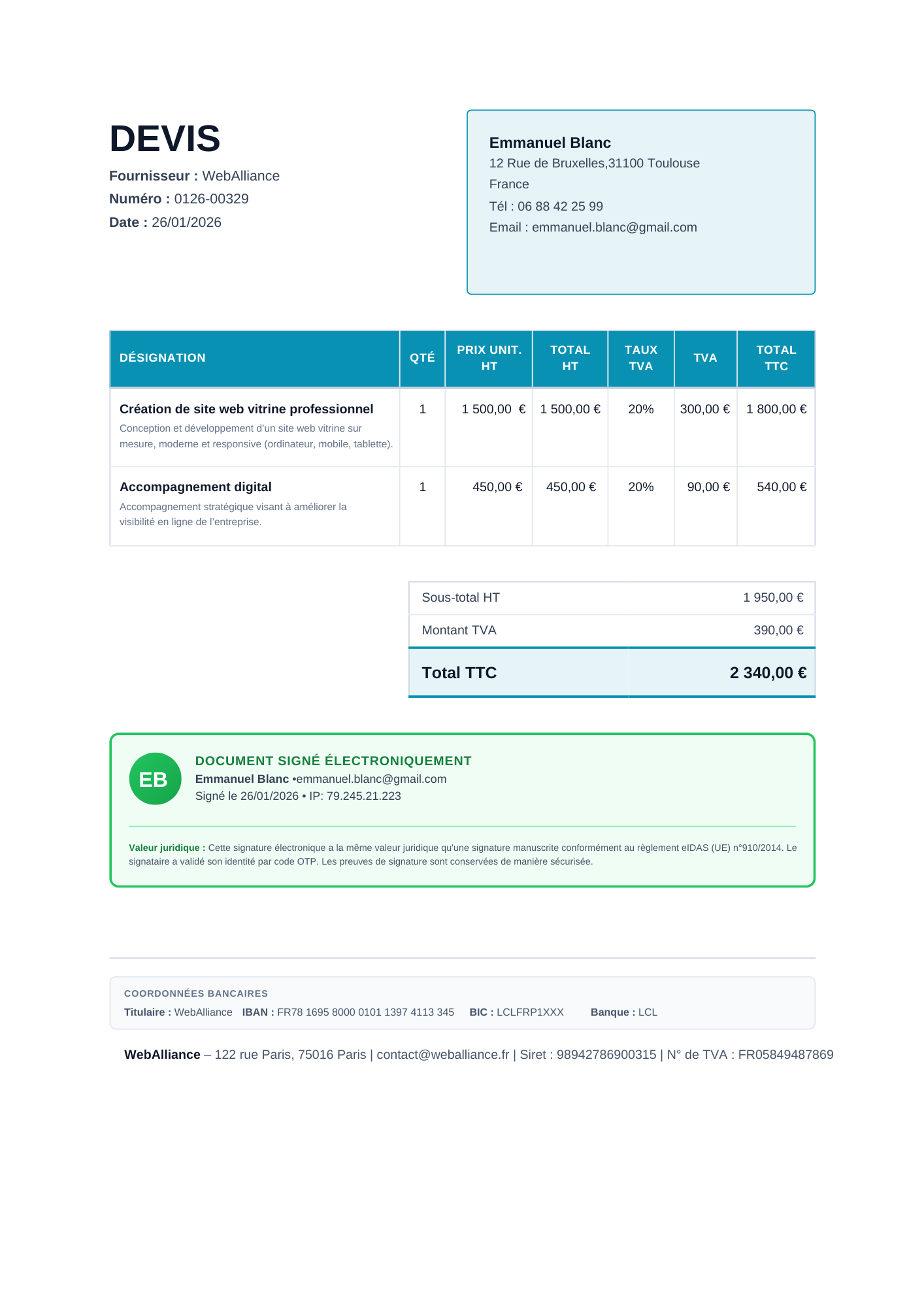 Que vous soyez artisan, freelance ou prestataire de services, Lio s'adapte à vos besoins spécifiques : gestion TVA, modèles de devis, catalogue produits...
